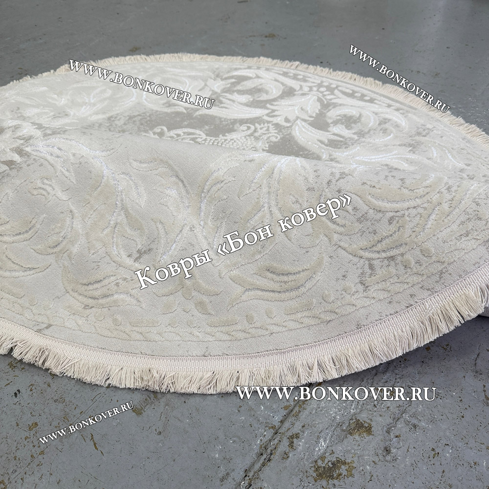 Изящный Белый Круглый Ковер Для Гостиной Медальон Дизайн 30533 наполняет интерьер гостиной теплом и уютом, гармонично сочетает в себе изящество и красоту. Он изготовлен из высококачественных материалов, комфортный и долговечный.